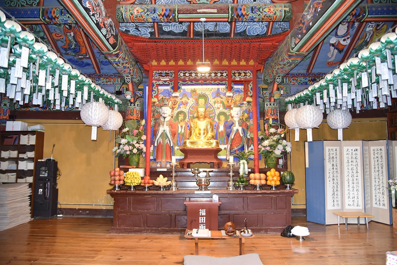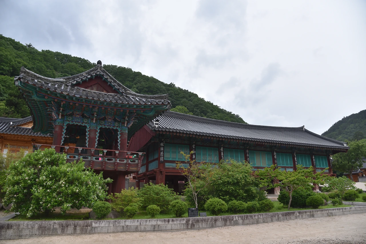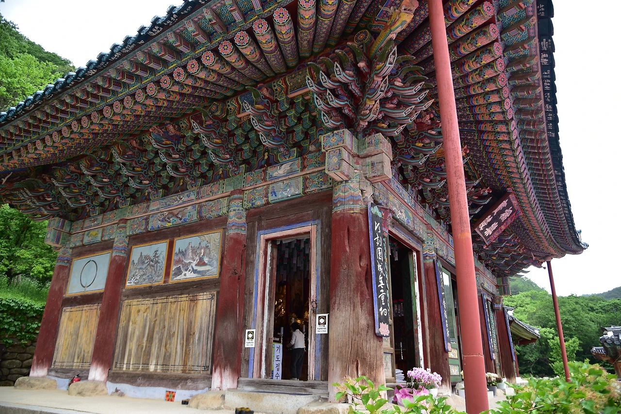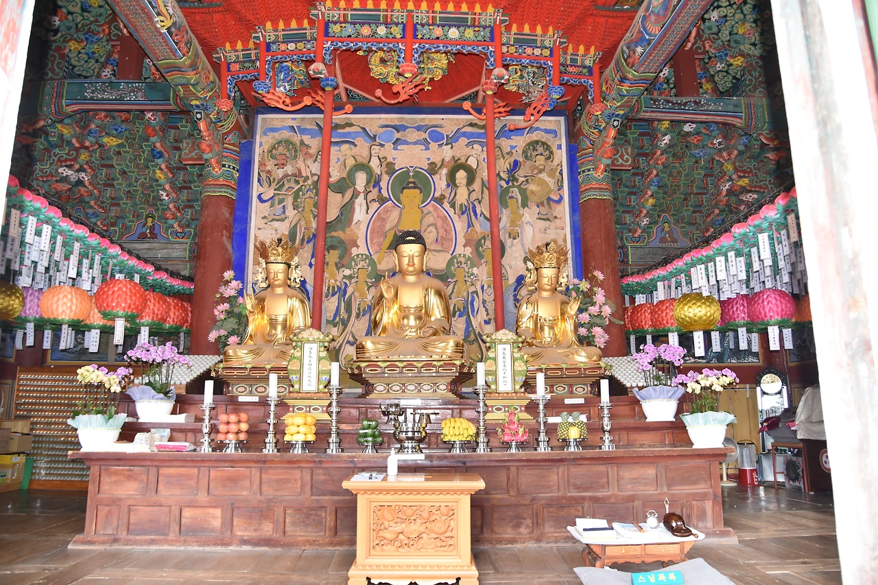보제루를 아래를 지나니 머리 위로 연등이 가득하다. 아무래도 부처님오신날이 지난 지 한 달이 채 지나지 않아서 그런가 보다. 정면으로 인조 25년(1647)에 처음 지어진 극락보전이 보인다. 조선 후기에 지어져서 그런지 공포가 기둥과 기둥 사이에 여러 개 있는 다포양식의 사찰인데, 지붕 정면 양쪽으로 긴 기둥이 세워져 있다. 아무래도 350년의 세월을 버틴 지붕의 침하를 막기 위해서 설치한 것 같다. 지붕 아래 단청은 다채로운 색으로 화려하게 장식되어 있다.
