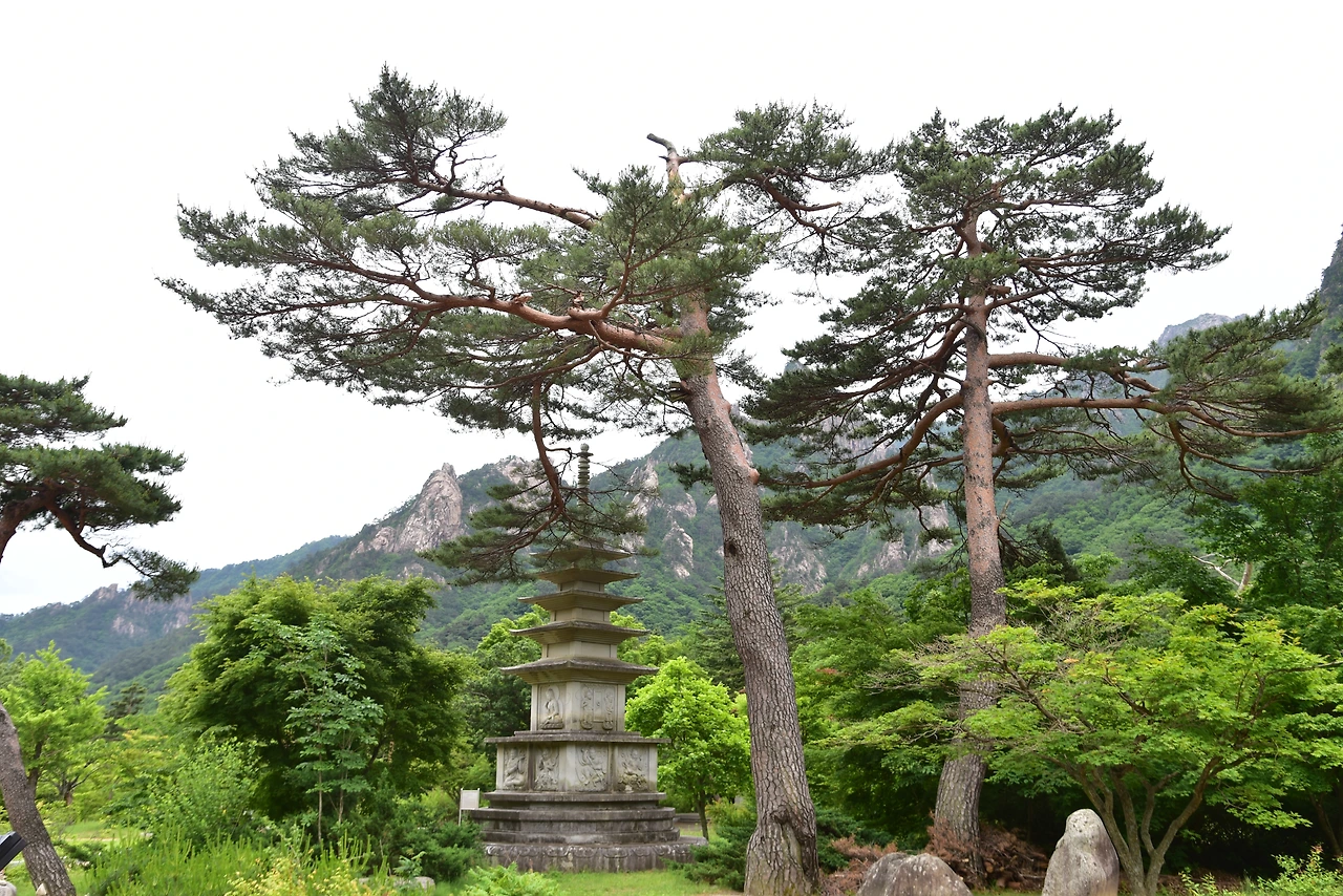 곰이 있는 동상에서 좀 더 걸어가면 거대한 오층석탑이 뒤쪽에 있는 소나무 둘과 위용 있게 서 있다. 받침돌에는 팔부신중, 그 위 몸돌에 사불상이 있는 형태인데, 비천상을 뺀 진전사지 삼층석탑과 매우 유사하다. 비교적 근래에 지어졌는데, 통일을 기원하기 위해 지은 석탑이다. 하긴 속초는 한국 전쟁 이전에는 북한에 속했다가 우리가 수복한 땅이기도 하니까. 석탑 왼쪽으로는 1951년 5월~6월 동안 설악산에서 전투를 치른 영령들을 기념한 설악산지구 전적비가 있다.