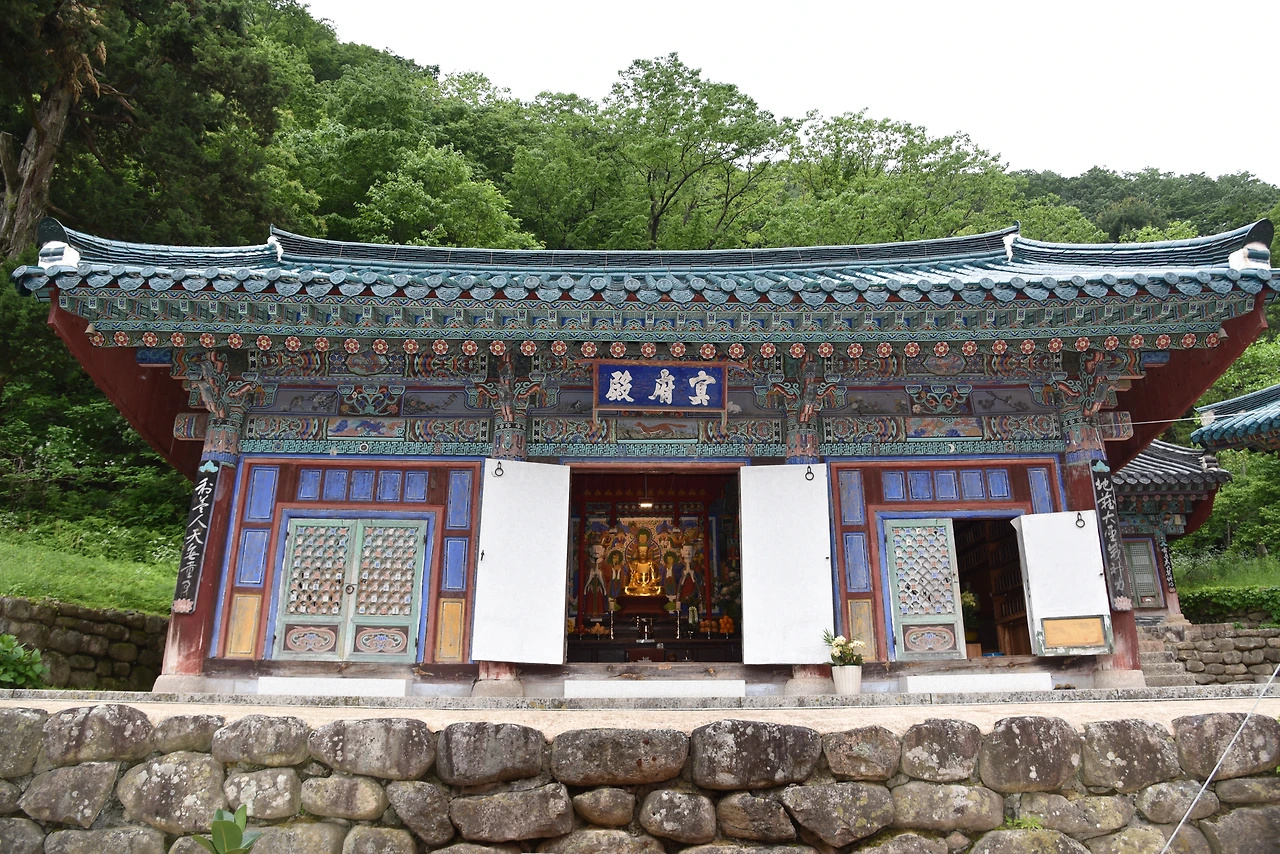 극락보전 왼쪽으로도 건물이 하나 보이는데 바로 영조 13년(1737)에 창건한 명부전이다. 명부전 가운데 문이 양쪽 문보다 훨씬 큰데 부처와 스님들이 드나드는 문이라고 한다. 그리고 양쪽문은 높이가 상당히 낮은데 재가불자가 고개를 숙이고 들어가게 설계를 한 것이다. 즉 성스러운 곳이니 자신을 낮추고 들어가라는 의미다.