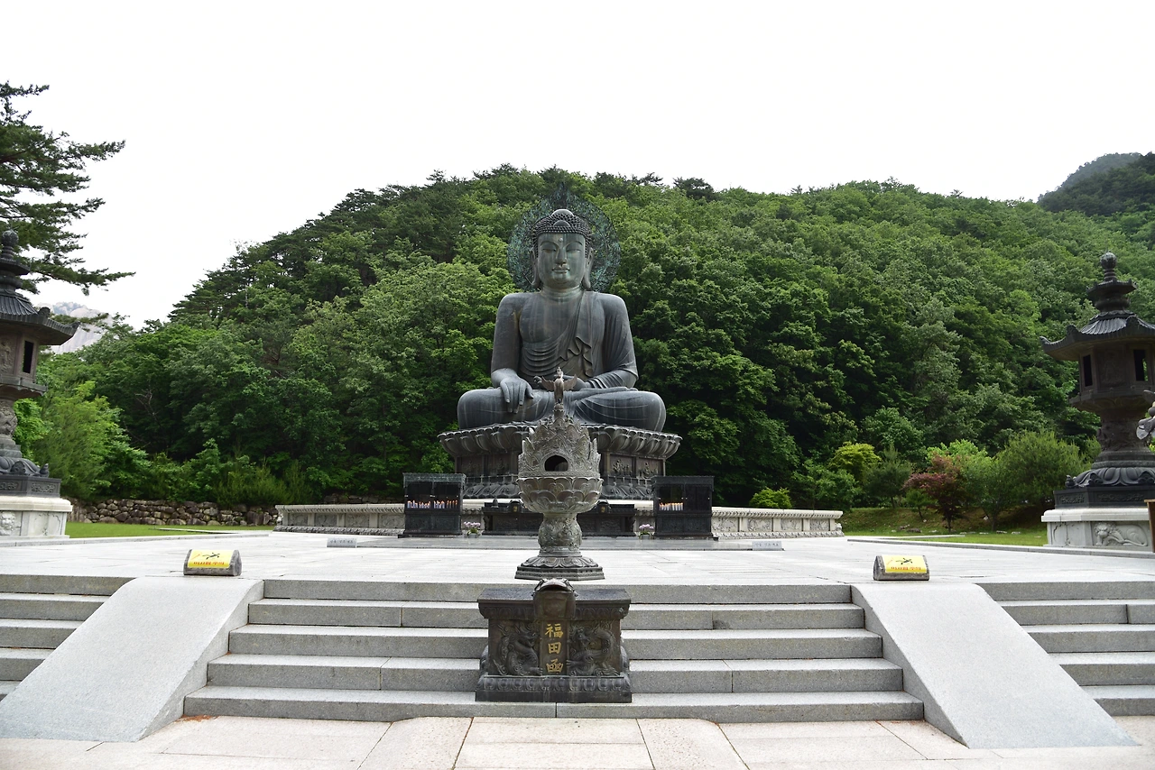 케이블카를 타고 다시 내려간 다음 다시 왼쪽으로 향하면 신흥사로 갈 수 있다. 일주문을 지나고 오른쪽 편을 보면 거대한 청동불상이 하나 보이는데, 입구의 석탑과 같이 통일을 기원하며 만든 대형 석가모니불이다. 1987년 8월에 조성하여 1997년 점안식을 가졌다는 걸 보면 무려 10년에 걸친 역사라고 해야 할까나. 석가모니불 앞에 복전함이 하나 보이는데, 복전함 위로 특이하게 생긴 향로가 보인다. 아무래도 백제 금동대향로를 복사한 것이 아닌가 싶다. 지난번 남북연락사무소 폭파사건으로 인해 남북관계가 아직까지 냉각기인데, 다시금 교류할 수 있을지 모르겠다.