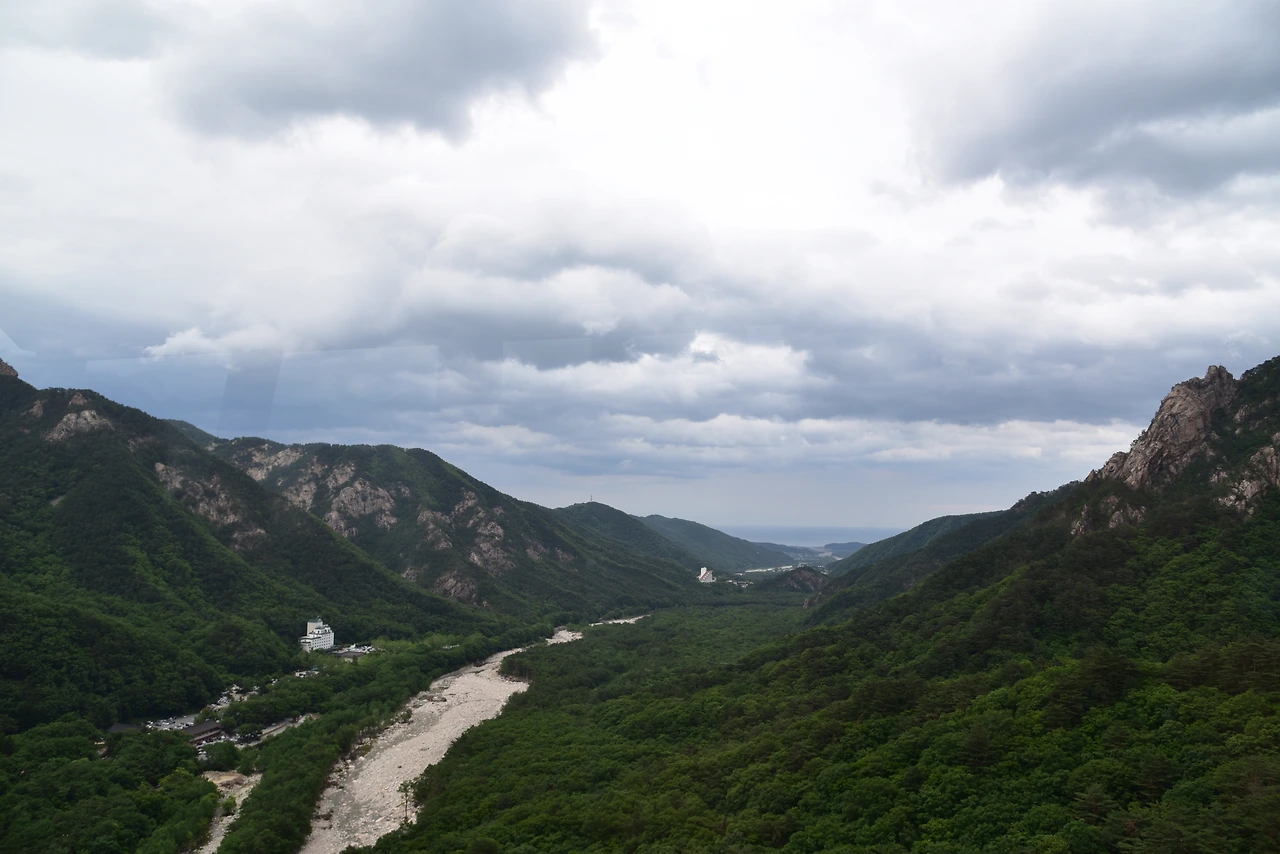 케이블카에서 바라본 골짜기 전경. 왼쪽에 신흥사가 보인다.