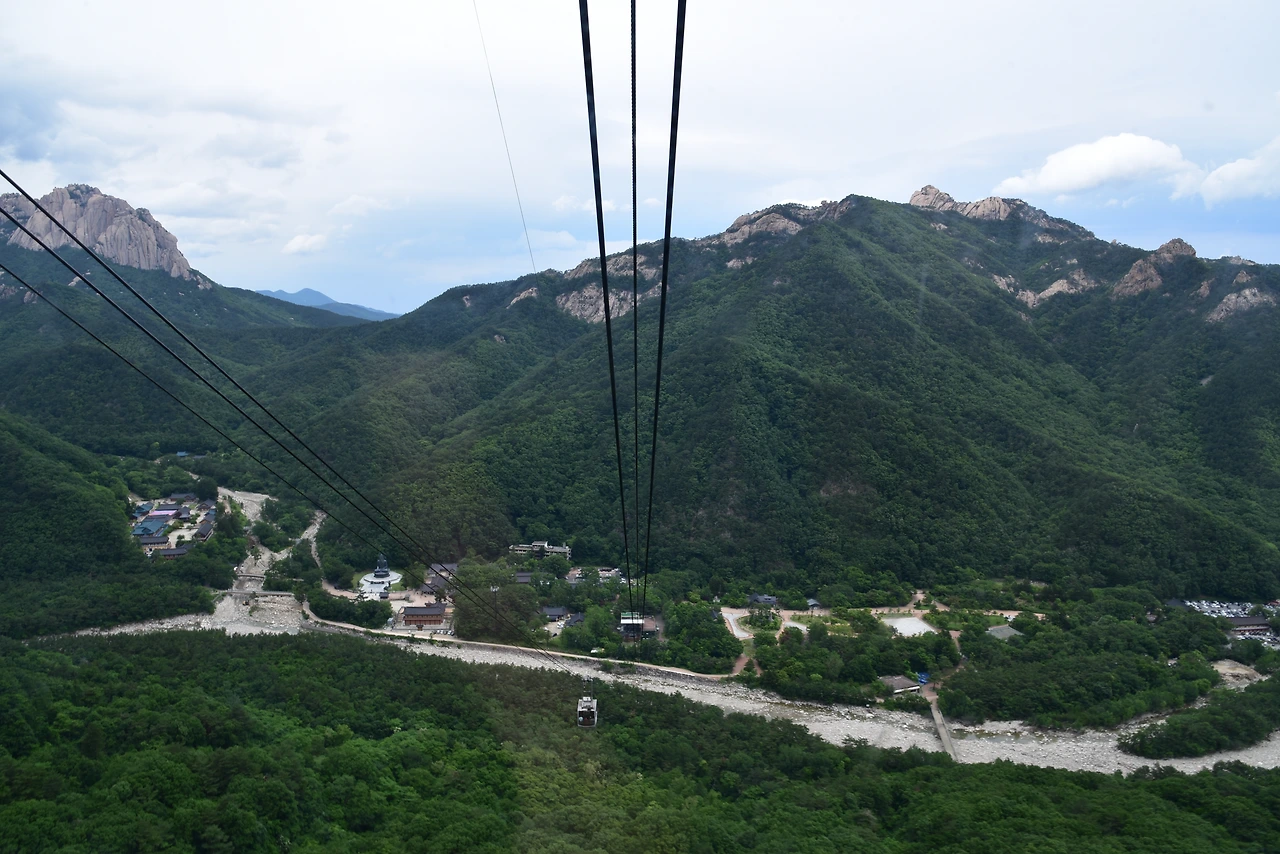 오늘날 케이블카 요금은 성인 기준으로 11,000원인데 이전과 달리 상당히 빠른 속도로 올라간다. 케이블카를 출발했던 곳을 바라보니 선착장 왼쪽에 신흥사, 오른쪽에는 소공원이 훤히 보인다. 그리고 케이블카 오른쪽 편으로 바라보니 두 산 자락 사이로 흐르는 쌍천을 볼 수 있다. 한 5분 정도 지나서 인가. 권금성 선착장에 도착했다는 방송이 들린다. 어릴 때 왔을 때보다는 상당히 빠르게 올라간 느낌이다.