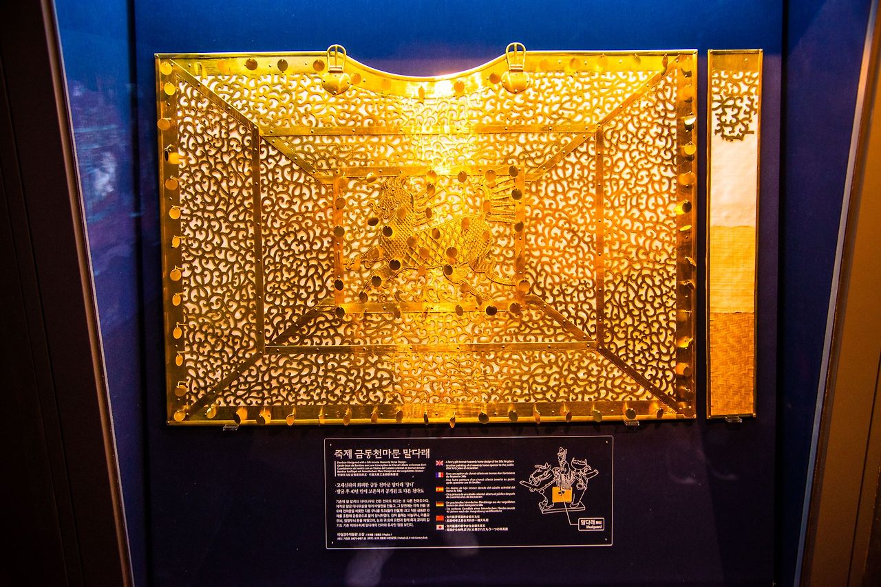그런데 전시관을 보니 내가 몰랐던 또 다른 두 천마도가 있다. 하나가 백화수피제 천마도 말다래, 또 다른 하나는 대나무살을 엮어 바탕판을 만든 다음 금동판에 천마문을 새긴 죽제 금동천마문 말다래다. 이 두 천마도는 발견될 때 보존 상태가 상당히 좋지 않았다고 한다. 그래서 경주국립박물관에 특별 보관되었다가 2014년 3월이 되어서야 공개 되었다.
