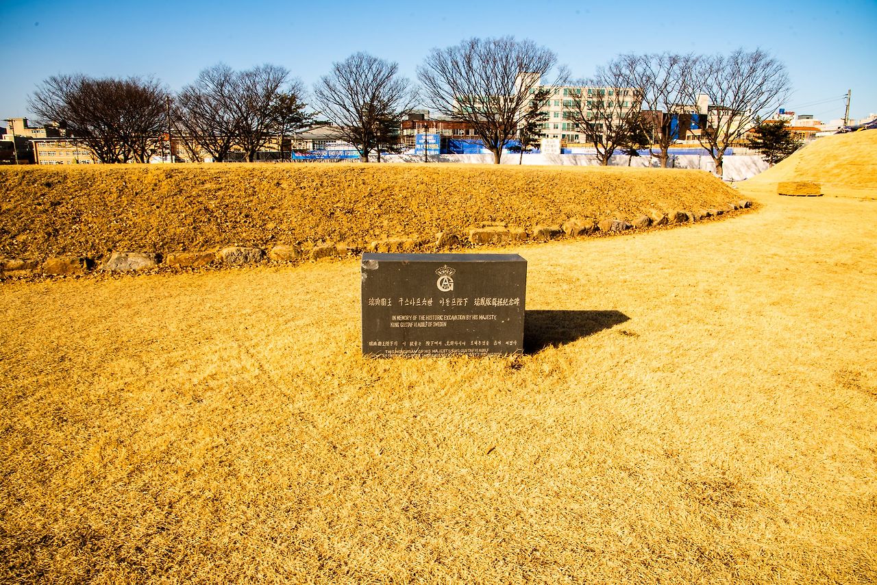 그루터기만 남은 서봉총 앞 기념비 - 일제강점기 시절 구스타프 6세 아돌프 황태자의 방문을 말해준다.