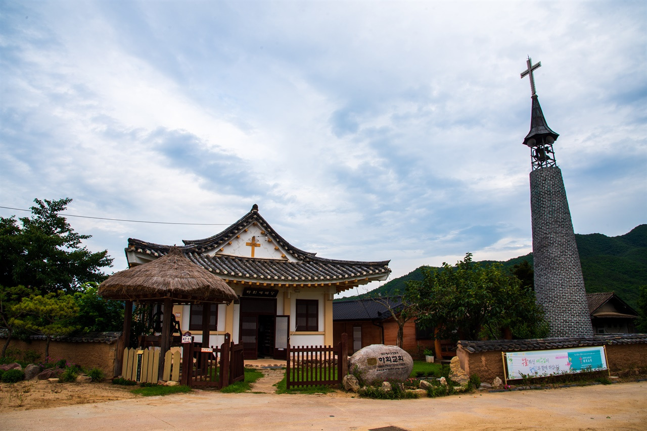 교회는 마을 남편 외곽에 있다. 예배당은 전통 기와 형태의 수수한 건축양식인데, 원래 마을의 중앙부에 있었다가 마을의 새벽 종소리 소음을 줄이고자 1990년 현 위치로 이전했다고 한다. 최근에 지어져서 역사가 짧은 걸로 생각했는데, 무려 1921년부터 100여 년 역사가 있는 교회다.