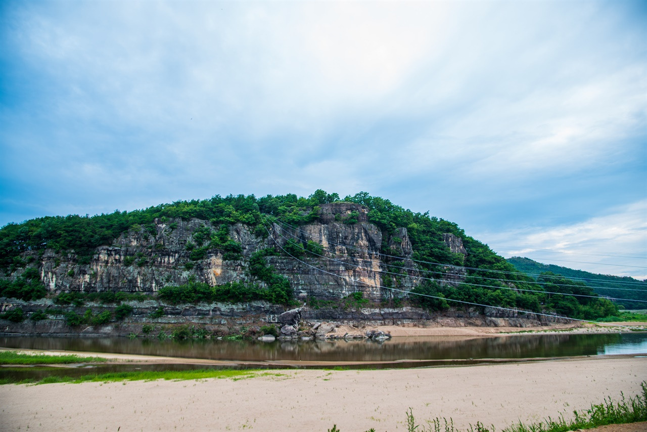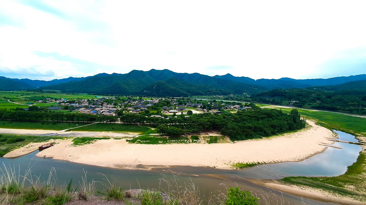 마을 건너편 부용대. 부용대 오른편에 서애가 징비록을 썼던 옥연정사가 있다. 원지정사와 낙동강을 사이로 마주 보고 있다.