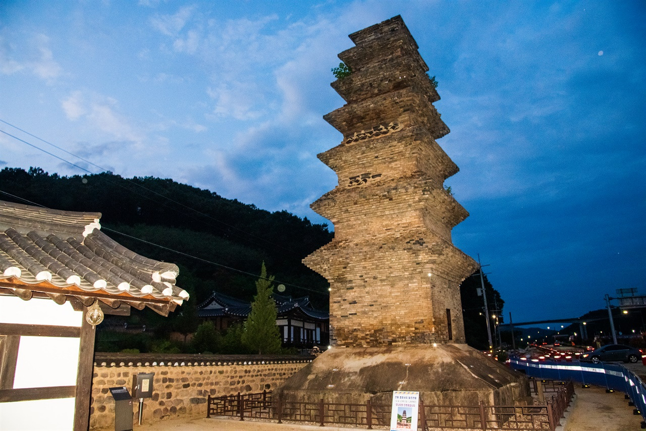 국보 제16호 법흥사지 칠층전탑. 우리나라에서 가장 오래되고 규모가 큰 전탑이다. 2층과 3층 지붕돌에 기와 흔적이 있는데, 이는 목탑의 형식을 번안했음을 보여준다.