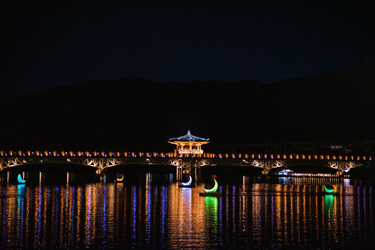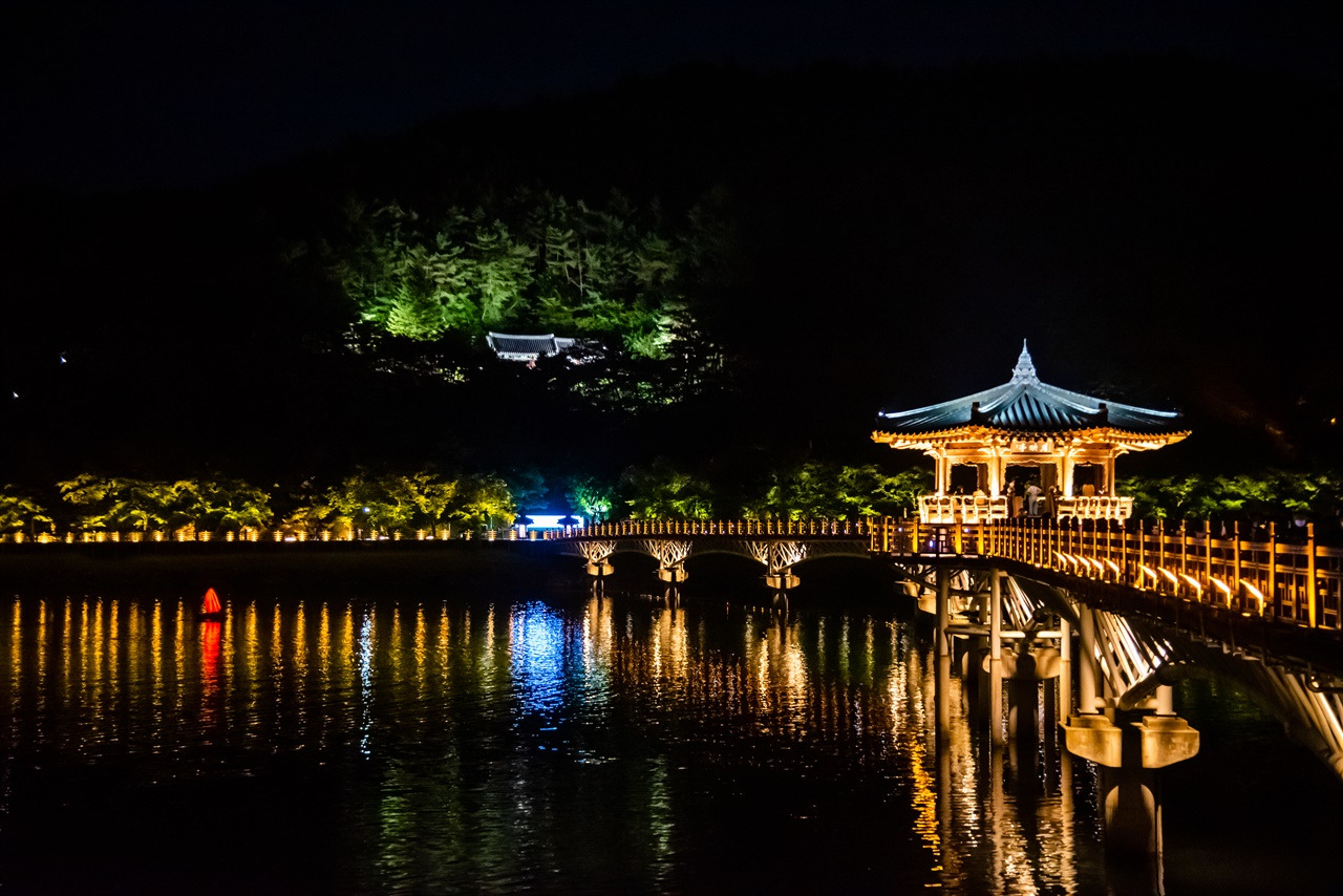 임청각에서 안동댐으로 거슬러 가면, 화려한 불빛으로 가득한 목조 다리가 있다. 비교적 최근인 2003년에 지은 월영교인데, 안동댐 때문에 시원해서 그런지 수많은 인파들로 가득했다. 월영교 아래에는 개목나루에서 출발한 수많은 색깔로 가득한 달 모양의 보트들로 가득해 아름다운 야경을 선사한다.