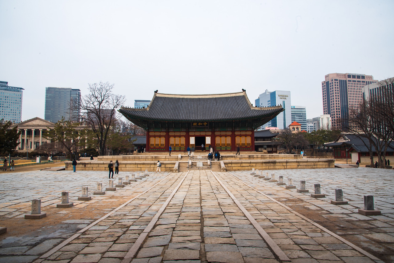 덕수궁 정전인 중화전. 20세기에 완공되었다. 1902년 최초로 준공되었을 때는 2층 전각이었지만, 대화재 이후 재건되었을 시에는 규모가 줄었다.