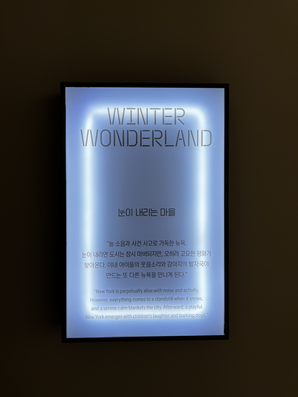 겨울, 눈이 소복이 쌓인 뉴욕에서의 순간들을 담은 작품들이 전시된 공간이다.