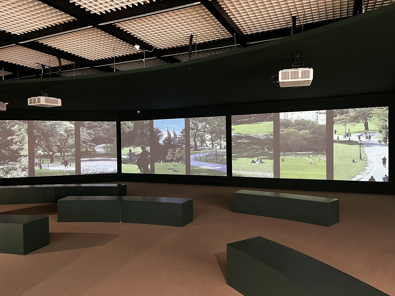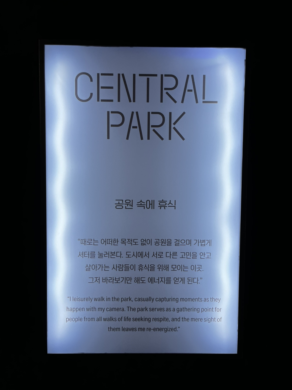 한쪽 벽면에서는 센트럴파크의 일상을 담은 영상이 다양한 구도와 비율로 반복해서 재생되고 있는데, 의자에 앉아 탁 트인 화면을 가만히 보고 있노라면 마치 내가 뉴욕의 센트럴파크 어느 벤치에 앉아 사람들을 관찰하고 있는 것처럼 느껴진다.