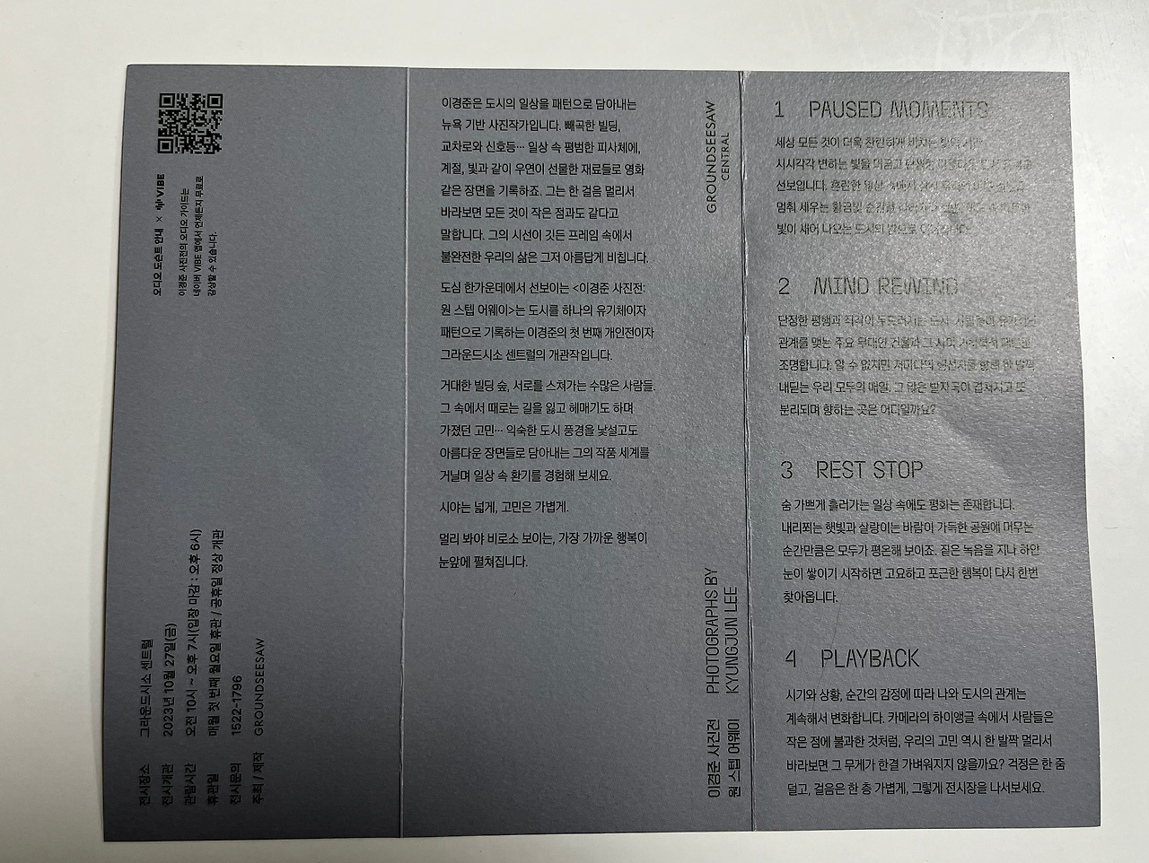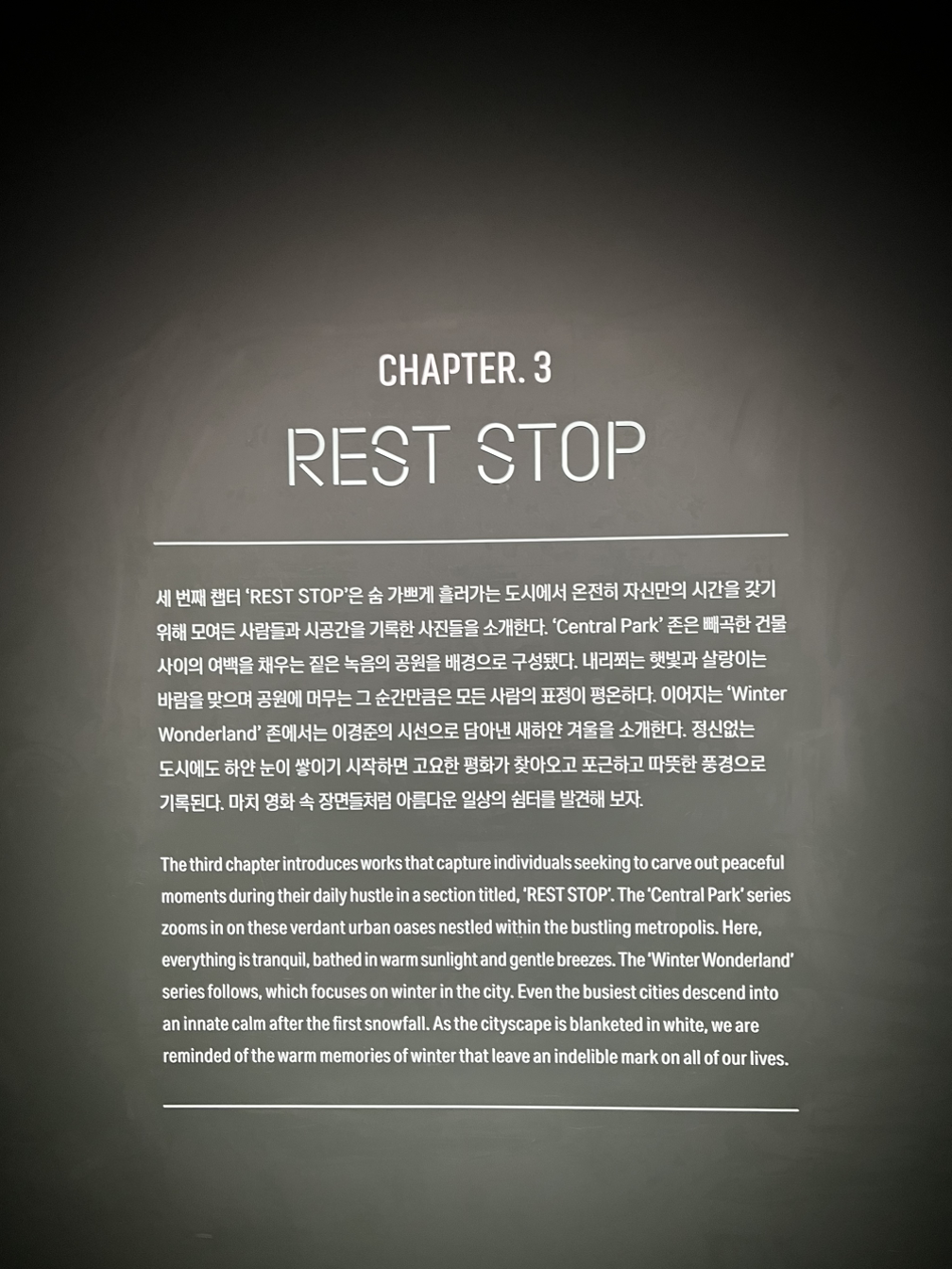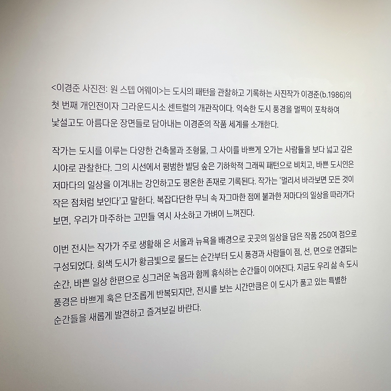 도시와 사람들을 멀리서 보는 앵글로 아름답게 담아낸 이 전시와 잘 어우러지는 메시지이다.