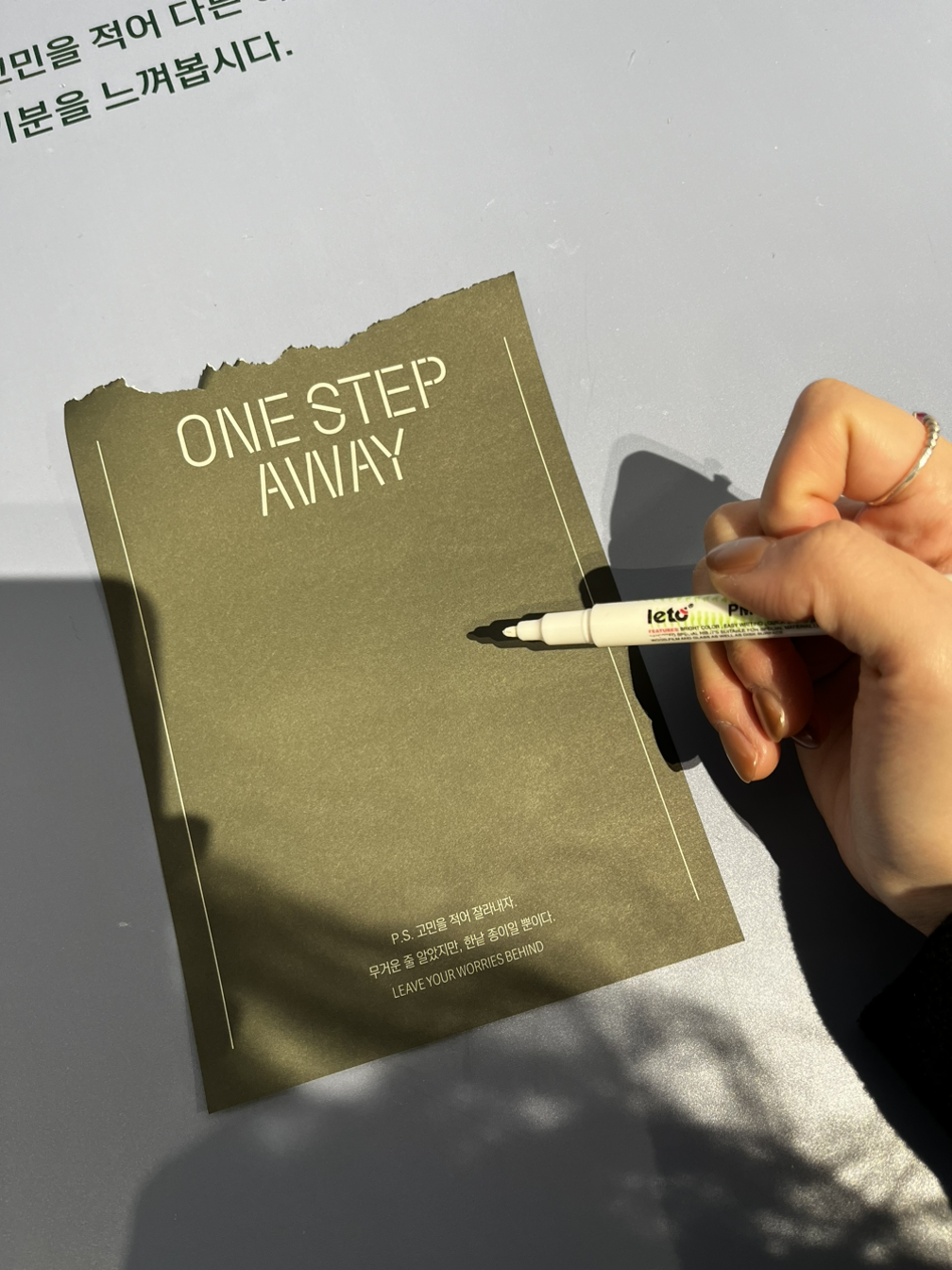 아주 잠깐이었지만 내 마음을 내내 무겁게 짓누르고 있던 고민이 어쩌면 종이 한 장에 담기고 쉽게 갈릴만큼 별 거 아닐 수도 있겠다는 생각에 해방감이 들었다.