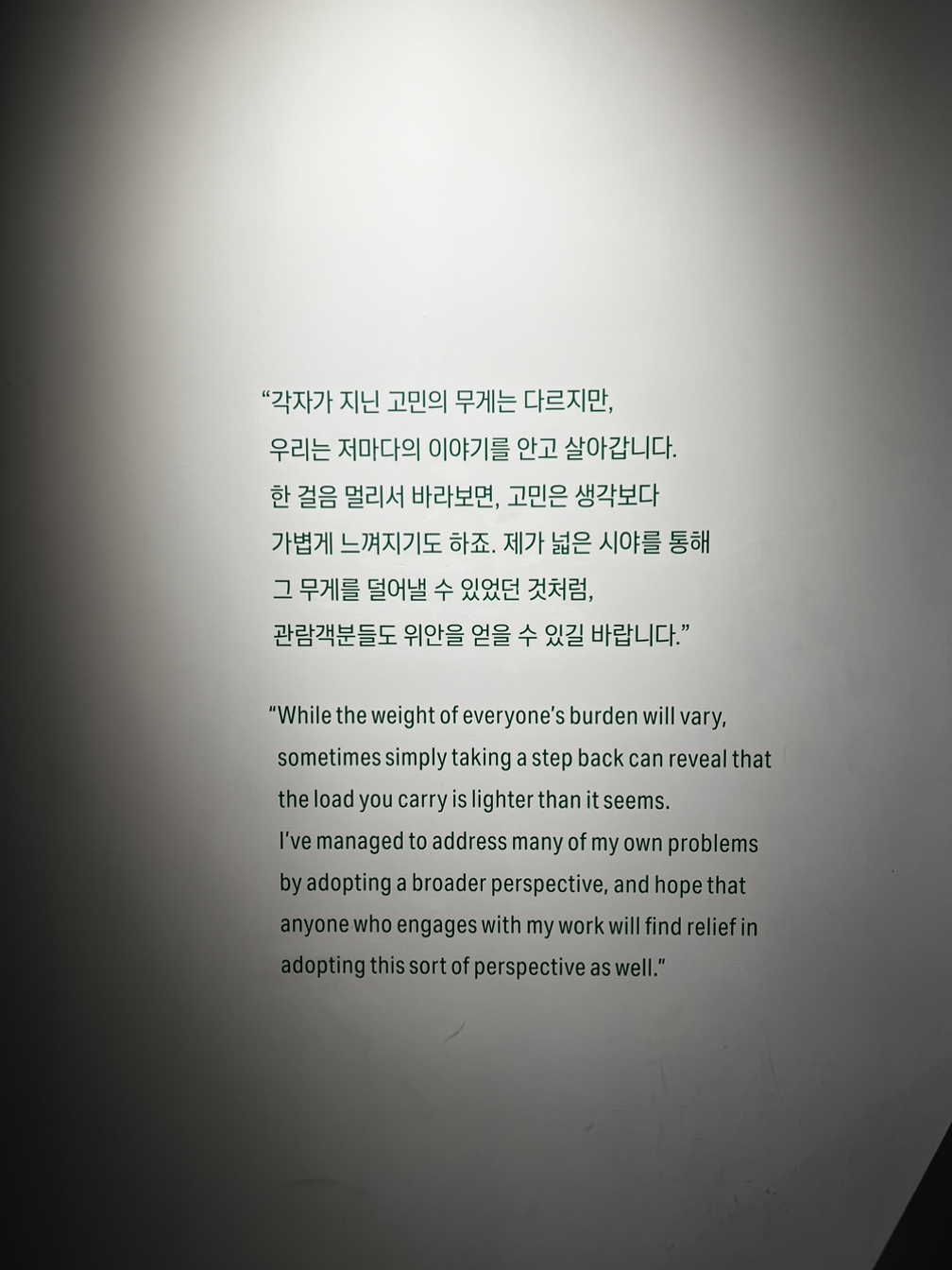 이러한 고민의 경중은 다를지라도 마음 한편에 무겁게 자리 잡고 있다는 사실은 비슷할 텐데, 작가는 개개인이 가진 고민을 한 걸음 멀리서 바라보며 무게를 덜어낼 수 있도록 메시지를 던진다.