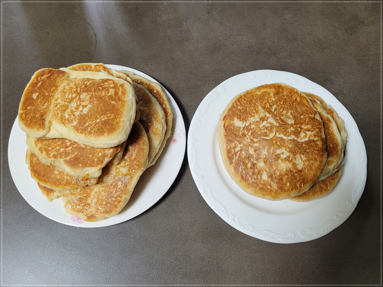 왼쪽은 모짜렐라가 들어간 치즈호떡, 오른쪽은 일반 꿀호떡 (호떡 믹스 아님. 직접 제조한 호떡임)