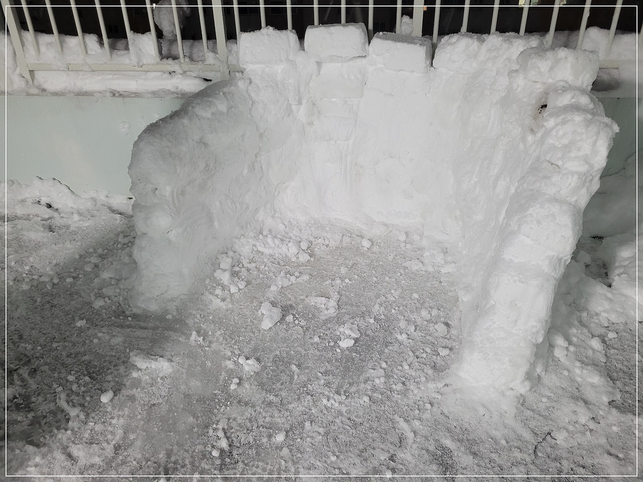 한 시간 늦게 등교를 했던 아들 학교에서는 한파와 폭설로 인해 2시도 안돼서 일찍 하교를 시킨다는 문자를 보냈다. 그런데 아들이 30분이 지나도 집으로 안 온다. 핸드폰으로 전화를 해도 통화가 되지 않아서 무슨 일이 생긴 건지 걱정이 되기 시작했다. 아들 친구 부모님께 전화를 하니 친구는 벌써 집으로 온 상태. 아들은 왜 안 오는지 물어보니 아마도 학교에서 점심시간에 작업(?)하다만 이글루를 만들고 있을 거라고 아들 친구가 전했다. 이렇게 날도 추운데 이글루라니. 다행히 하교 시간보다 1시간 늦게 온 아들이 직접 만든 이글루라며 사진을 보여줬다. 하나하나 정성 들여 쌓은 모습을 보니 꽤나 그럴듯한 모습이다.