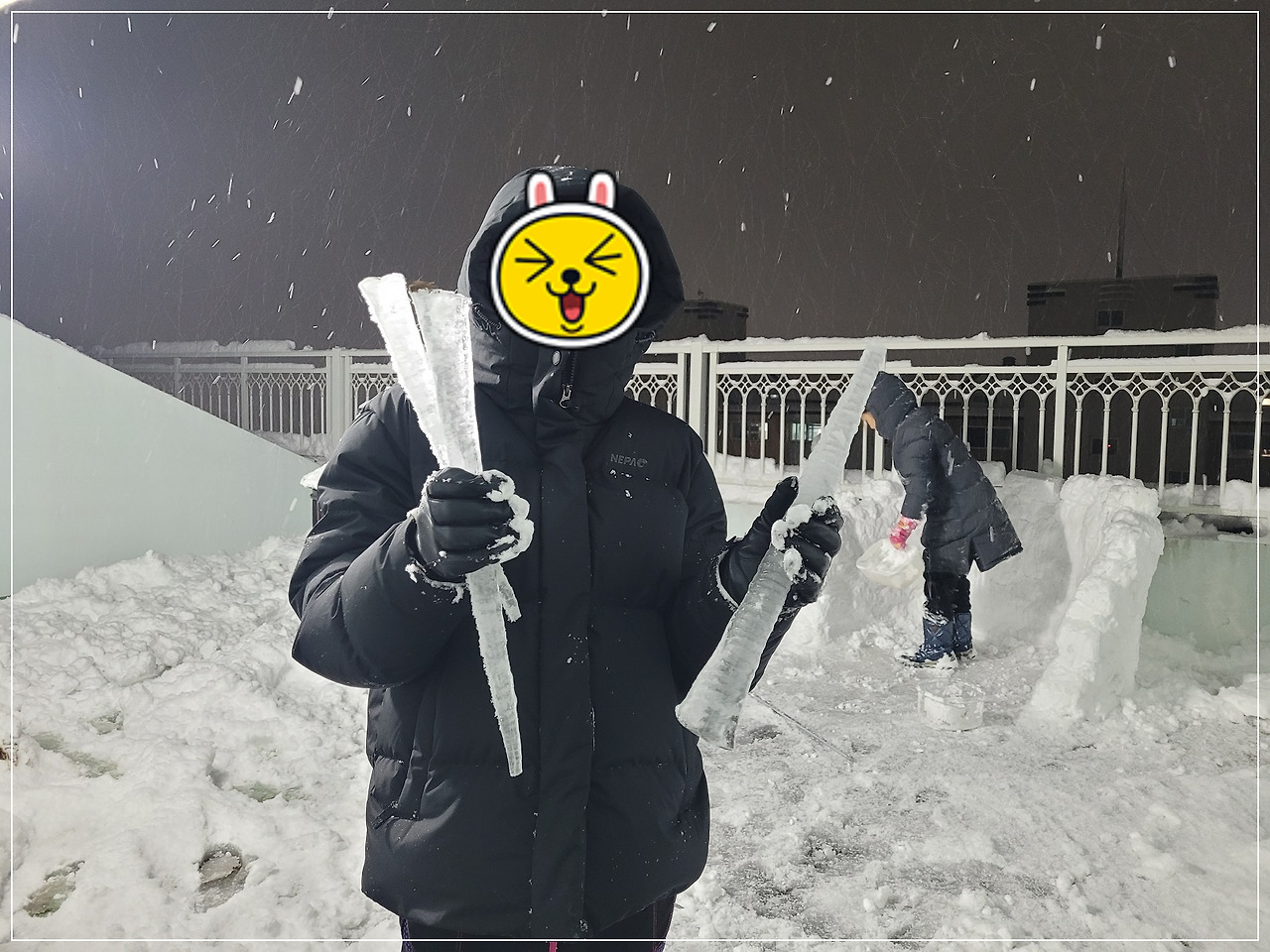 호떡을 맛있게 먹은 두 딸들은 낮에 오빠가 만든 이글루 사진을 보고는 자신들도 이글루를 만들어야겠다며 옥상에서 이글루를 만들고 있다. 추위에도 아랑곳하지 않고 열심히 네모난 플라스틱 통에 눈을 가득 담아 꾹꾹 눌러서 눈벽돌을 만든 후에 차곡차곡 이글루를 쌓아 올렸다.