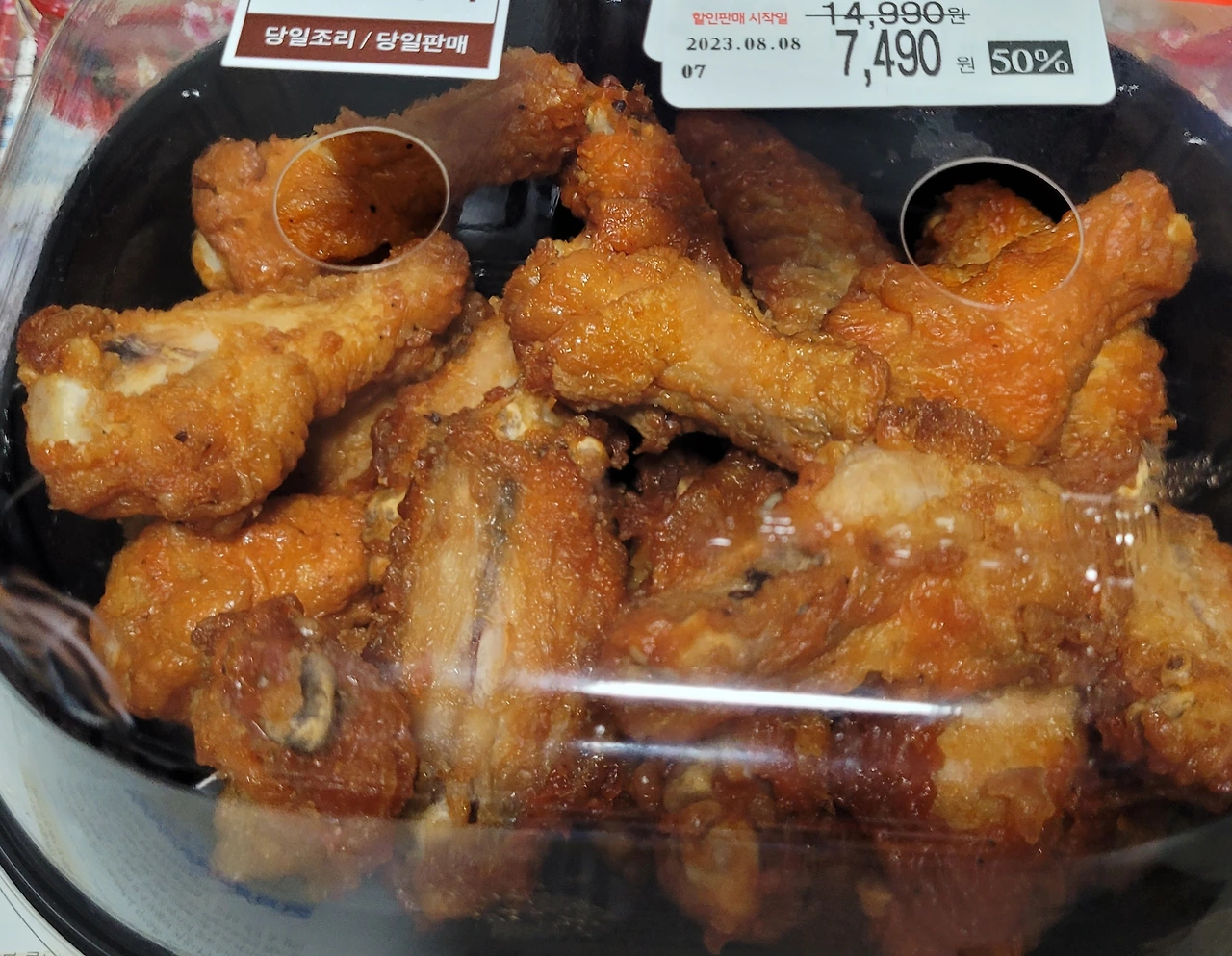 어제도 늦은 퇴근 후 마트에 들러서 집에 온 남편의 장바구니에는 초밥 3 상자, 치킨 2 상자, 복숭아가 담겨 있었다. 초밥 9,900원짜리는 4,990원에, 14,990원짜리 버펄로윙은 7,490원, 6,990원짜리 당당 치킨은 3,490원으로 50%의 할인을 받은 것이었다. 복숭아 몇 개 겉면에 검은 점들이 있던 것을 제외하고는 아주 멀쩡했는데 칼로 깎아서 먹으니 그야말로 꿀맛 딱딱이 복숭아였다. 그것도 복숭아 2 상자(1 상자당 7개입)를 1만 원도 안 돼서 가져오다니!