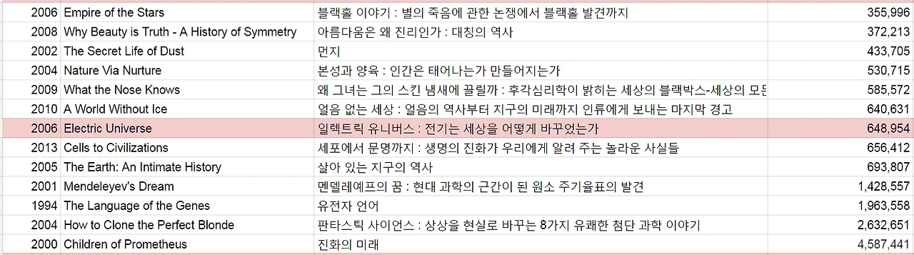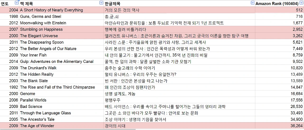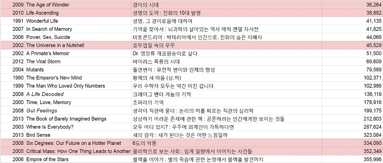 나처럼 어디서부터 시작해야할지 모를 문과사람들을 위해서는, 이 상의 본선 후보 리스트 & 수상작 리스트가 과학 탐험을 시작하는 데 있어 나름대로 도움이 되리라 생각한다. (나도 이 안에서 몇 개 책을 구매해서 읽고 있다)