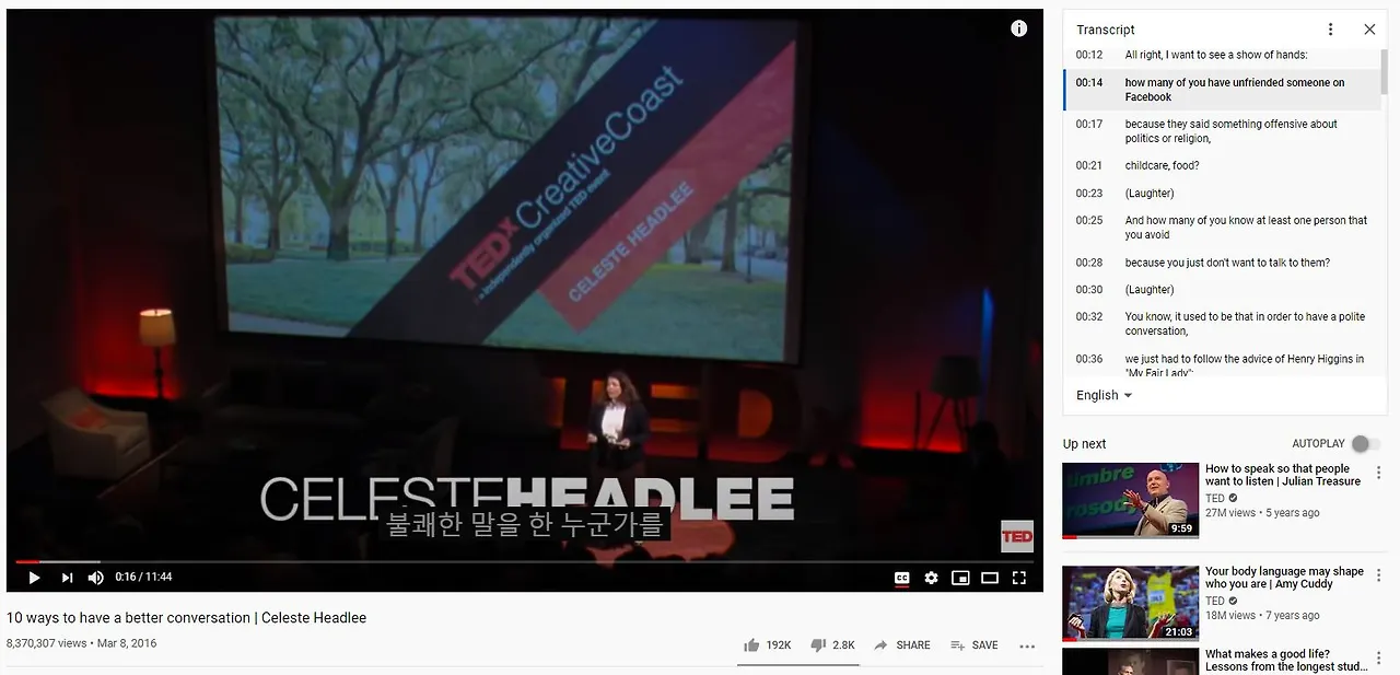 TED 영상 중 Most viewed 순으로 정렬해서 1) 내가 관심있는 주제 2) 내가 닮고 싶은 발음/톤 3) 여성 연사의 영상으로 주로 쉐도잉을 했다. Youtube TED 채널에 가서 하면 어느 정도 이후로는 리스트가 잘려서 안 나오는 문제가 있어서 실제 어떤 영상으로 할지는 TED 공식 사이트 에서 보고 정하고, 실제 쉐도잉은 자막이 잘 되어있는 유튜브에서 했다.