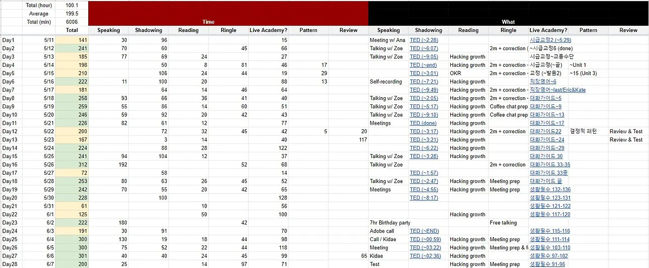 이전에 인턴십을 시작하기 전에 28일간 영어를 100시간 동안 말하는 훈련을 하겠다고 말한 적이 있었는데, 이번 글은 그 공부방법 혹은 훈련방법에 대한 후기 글이 되겠다.