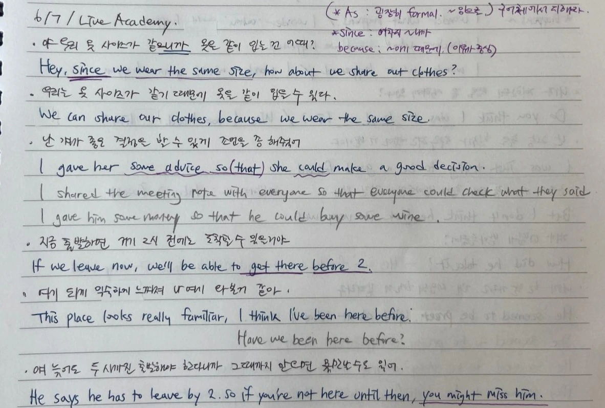이 선생님이 영어 표현을 보고 직접 따라해가면서 훈련할 수 있게끔 영상을 만들어주시고 진짜 딱 중급자가 (혹은 그냥 내가) 실수하거나 모르는 부분을 잘 짚어서 만들어주신다. 진짜 돈도 안 받고 이런 영상을 보다니 죄송할 정도로 고퀄이다. 이 샘 플레이리스트를 깬다고 생각하고 영상 하나하나에 나오는 표현을 외울 때까지 연습하면서 훈련했다. 특히 한글을 먼저 보여주고 바꿔보게끔 하는 경우도 있는데, 그러면 내가 말로 직접 못 만드는 표현이나 자주 하는 실수를 좀 더 명확히 알게 되고, 그런 내용들은 아래와 같이 노트에 정리했다.