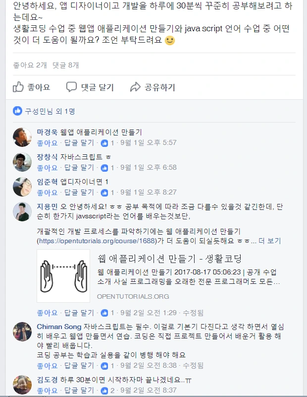 사실 이 강좌는 이전부터 알고 있었지만, 부끄럽게도 수업 주제를 잘못 이해하는 바람에 나와 맞지 않을거라고 생각해 시작하지 못했었다. (웹앱 = 앱같은 웹을 만드는 수업인 줄 알았음) 그러다가 개발자분들의 친절한 추천으로 이번 도전을 위 수업으로 시작하게 되었다. (출처: 생활코딩 스터디 페이스북 그룹)