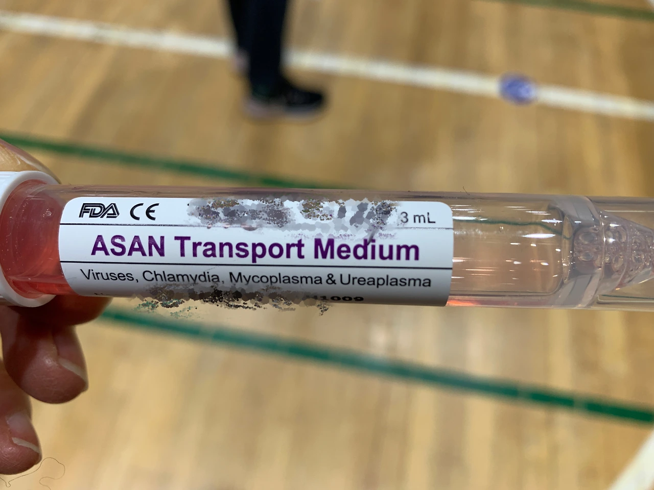 우리 순서가 되어 검사를 시작했다. 남편, 아이, 나의 순서로 검사를 받았다. 생각보다 씩씩한 딸아이를 보며 엄지 척을 해 주었다. 이런 상황에서 대견한 모습을 발견할 수 있어 눈물 날만큼 고마웠다. 긴장하지 않고 두려워하지 않고 있는 그대로 받아들여주는 모습이 나보다 낫다는 생각이 들었다. 접수하는 곳에 이름, 연락처, 주민번호를 알려주면 작은 시험관 같은 플라스틱 통을 준다. 그 통에 이름과 일렬 변호가 적혀있었고 붉은색 시약이 들어있었다. 의자에 앉아 검사를 기다렸다.