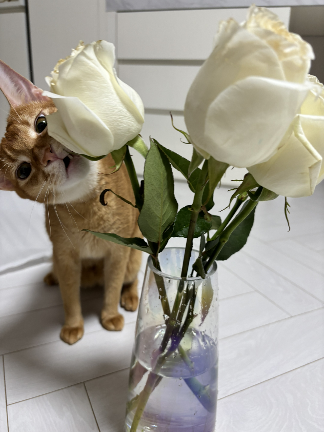 꽃 상자를 열자, 힝구가 연신 냄새를 맡기 시작했다. 그 모습을 보고, 빠르게 꽃병에 꽃을 세팅해 힝구 옆에 놔주었다. 그러자 힝구가 꽃에 볼을 문지르기 시작했다. 너 꽃을 좋아했구나. 힝구를 바라보다 '꽃을 든 OO' 오래전 유명했던 CF 멘트가 떠올랐다. 역시 힝구의 미모는 꽃 사이에서도 절대 지지 않는다.