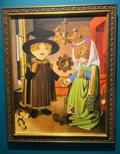 얀 반에이크의 '아르놀피니 부부의 초상'이라는 작품이 있다. 구도나 색감 그림 속 거울을 통해 자신을 드러내고 있는 화가를 찾는 재미 등등 개인적으로도 좋아하는 작품이다. 이 작품 또한 야마모토 슈의 의묘화 작업을 거친 후, 고양이 세계에서는 냥 반에이크라는 고양이 화가의 작품으로 소개되었는데, 무엇보다도 원작에서는 두 부부 사이에 자리 잡고 있던 반려견을 깨알 같은 재미로 고양이의 관점에서 생쥐로 바꿔 표현한 부분에서 그 재치가 눈길을 끌었다.