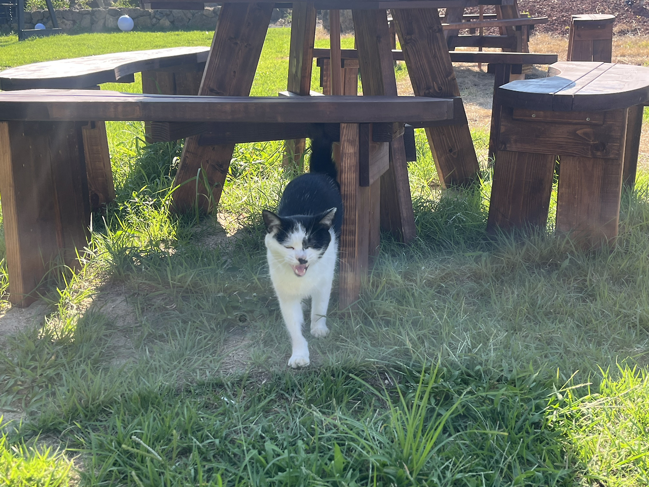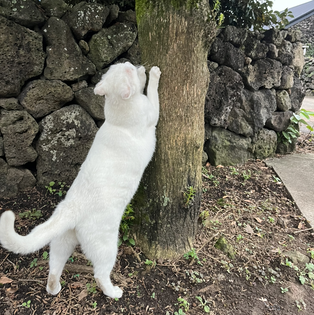 그러다, 조천읍 어느 골목길 귀여운 울음소리가 들려왔다. 고개를 돌리자, 새하얀 고양이 한 마리가 얌전히 앉아 나를 바라보고 있었다. 나는 인스타에서 본, 고양이 언어 중 ‘이리 와’라는 말인, ‘ma-ah’라고 말해봤다. 내 말에 화답하듯 고양이가 울기 시작하더니, 다가온다. 오드아이를 가진 고양이였다.