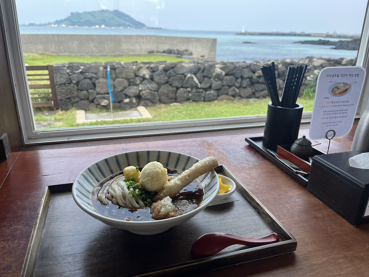 아, 오늘 찾아간 수우동이라는 맛집은 비양도를 바라보며, 자작냉우동을 먹을 수 있는 곳이다. 함께 나온 반숙 달걀튀김을 터트려 노른자와 섞어 먹으니, 맛이 깊어졌다.