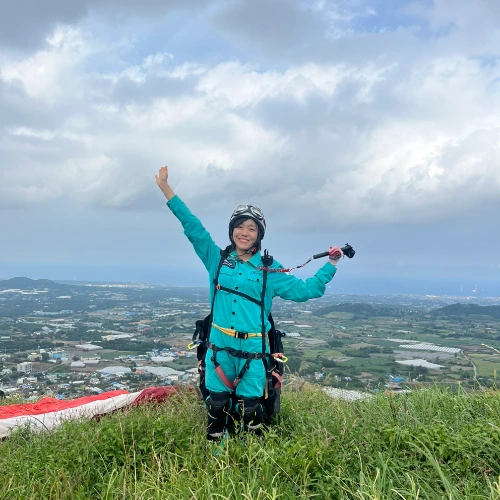 패러글라이딩을 위해 옷과 안전 장비까지 착용하고 차에 올라 오름 정상에 도착하니, 긴장되기 시작했다. 나를 태워주실 강사님께 놀이기구만큼 무서운지를 물어봤다. 여유롭게 웃으시며, 전혀 다르다고, 무서워할 거 없다는 말에 안심이 되면서도, 아직 알 수 없는 다음 상황들에 대한 불안함은 사라지지 않았다. 하지만 그 와중에도, 사진은 남겨야 했다.
