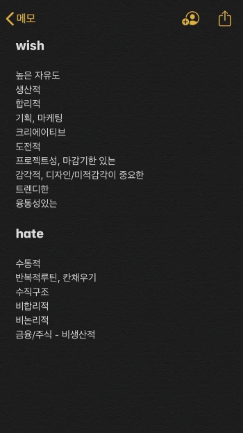 싫었던 일 : 주가관리, 3년 된 공시업무, 호텔 운영관리, 비전 없다 판단되는 신사업기획 - 반복되는 루틴, 나의 의지에 반하는 업무