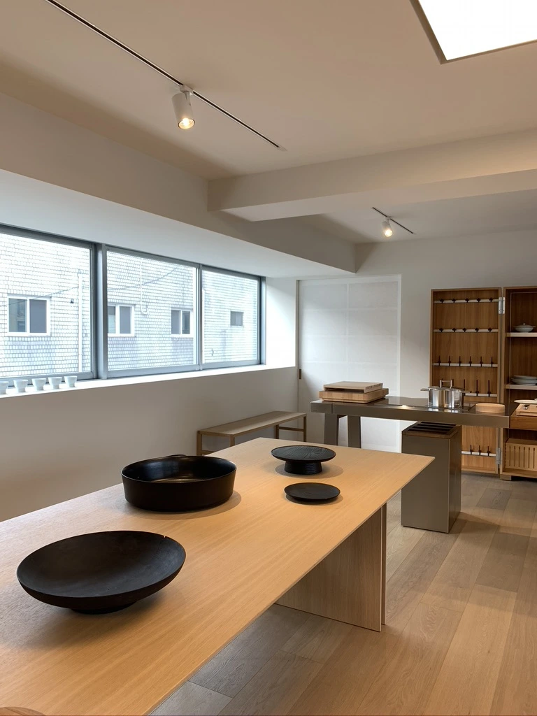 1층에는 강석근 작가의 옻칠을 한 목공예 작품과 모노하의 편집 제품들이 함께 있었다.