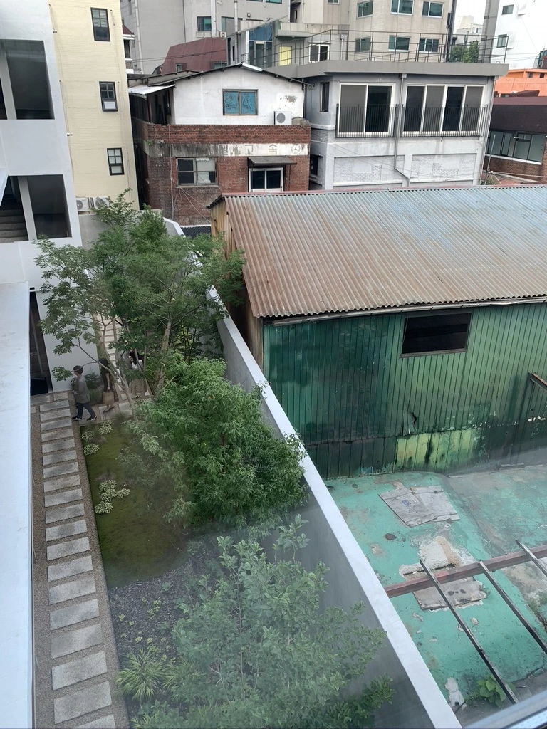 'ㄱ'자의 공간은 네 면의 창을 품고 있는데 모두 다른 느낌의 뷰를 담고 있다. 한 곳은 까뭇까뭇 세월의 흔적이 느껴지지만 장식도 색도 빠진 군더더기 없는 심플한 건물을, 다른 한 곳은 가로수의 초록잎을, 가장 넓은 창은 1층의 정원 담 뒤로 멋스럽게 녹이 슨 창고를 배경으로 하고 있었다. 각 층에서 사진을 찍을 때마다 걸리는 창밖의 풍경도 마음에 들었다. 층마다 달라지는 뷰도 좋았고..