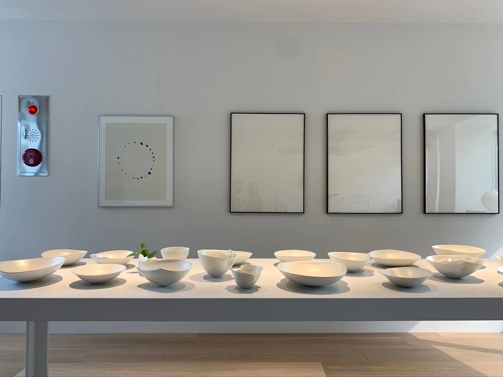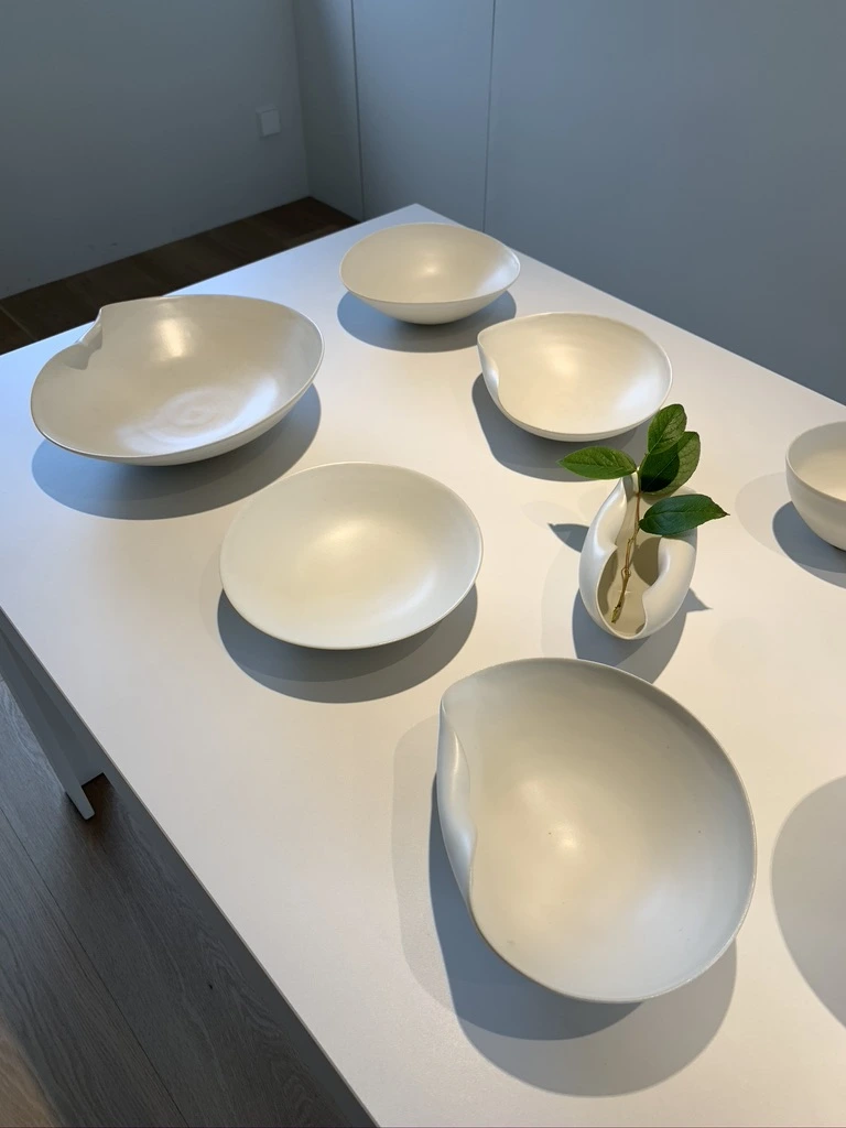 이 곳에 있을 때는 테이블 위의 그릇만이 눈에 뜨였었다. 끝을 말아올린 인위적이지 않은 비정형의 모양과 센스 있는 나뭇가지 하나가 생명을 넣었다고 생각하며 사진을 찍었다. 그리고 뒤의 아무것도 없는 흰 종이를 보면서 그저 하얀 자기와 잘 어울린다 정도 생각했었다. 친구는 옆에서 "와 설마 이것도 작품이가?" 라고 했었다.