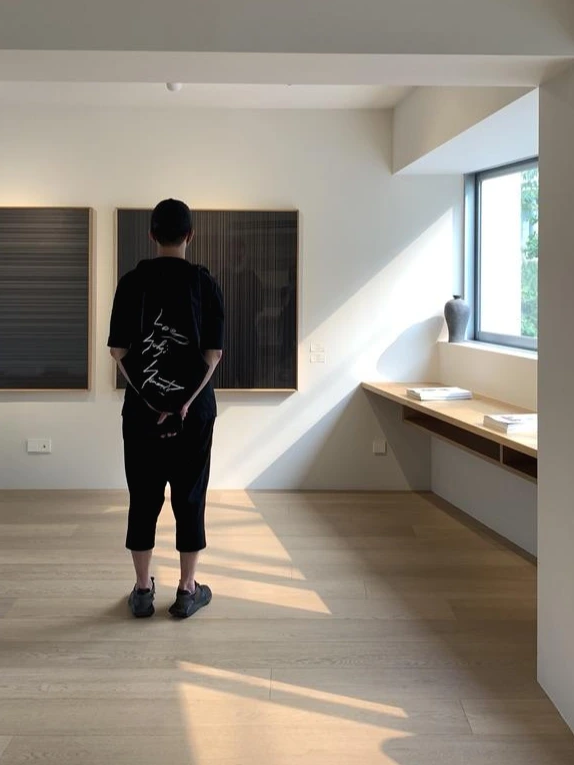 샤프심이 만들어내는 직선으로 작품을 만들어온 윤상렬 작가. 다양한 굵기와 농담의 샤프심으로 직선을 수없이 그어 화면을 채우고, 사람 손으로 그을 수 없는 미세한 선은 디지털 프린팅으로 그려 넣었다 한다. 검정이 매우 마음에 든다며, 본인도 이 작품은 할 수 있겠다고...