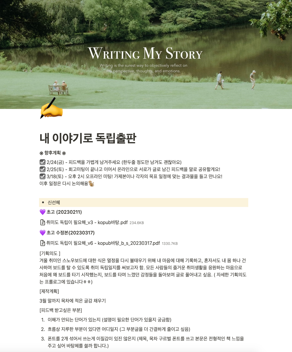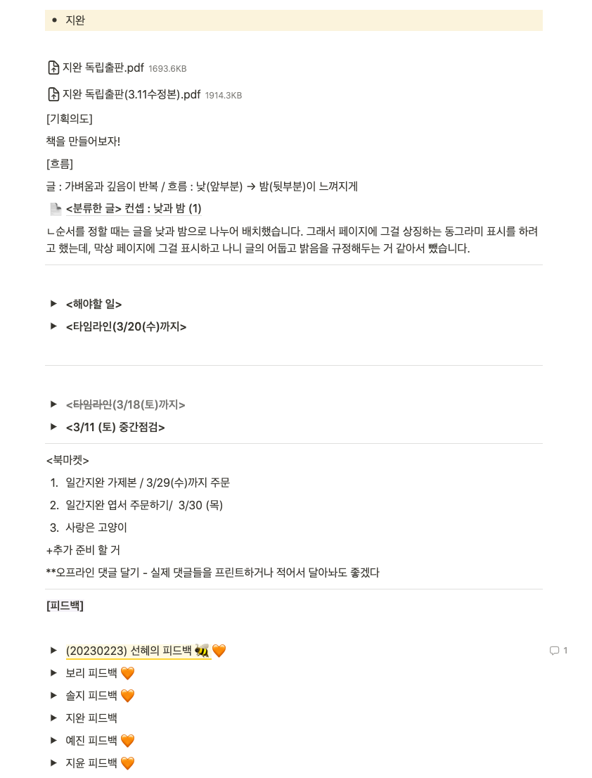 오프라인 미팅이 끝나고 글을 더 채워나갈 분들이 많지 않아서 바로 마감을 만들어 다음 단계로 진행해 보기로 했다. 오늘 나눈 기획의도와, 제작계획, 피드백을 받고 싶은 부분을 공유한 후 서로에게 피드백을 해주기로 했다. 그리고 한 달 후 다시 만나기로!