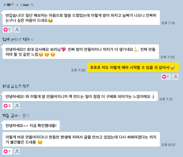이렇게 2월부터 3월 중순까지 따로 또 함께 각자의 글을 성실하게 업데이트해 나갔다. 읽던 책에서 공유하고 싶은 문장이 나오면 공유도 하고, 지칠 때는 서로 힘내자고 응원도 하면서 :)