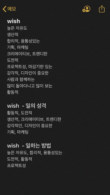 앞서 정리했던 나의 wish를 바탕으로 일의 성격이나 일하는 방법 등으로 카테고리화 하고 커리어 히스토리를 기반으로 하고 싶은 일을 할 수 있는 최선의 방법을 고민했다.