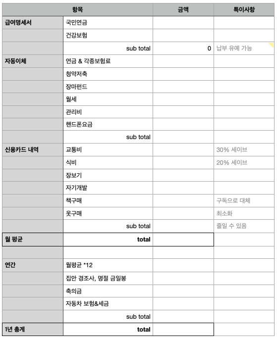 10년 넘게 일하면서 저축한 잔고가 쌓여있는 통장이 있고, 무리해서 영끌을 하지 않았기에 내 집도 없지만 빚도 없다. 급여명세서와 자동이체내역, 신용카드 명세서 등을 보며 평균적인 한 달 생활비를 계산해보고 1년 후 잔액도 예상해 본다.