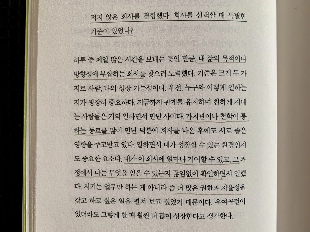 회사에서만 배울 수 있는 언어가 있다. 내 삶의 목적이나 방향성에 맞는 회사에서 권한과 자율성을 가지고 일할 수 있는 조직을 찾으려 노력했다. - 정혜윤