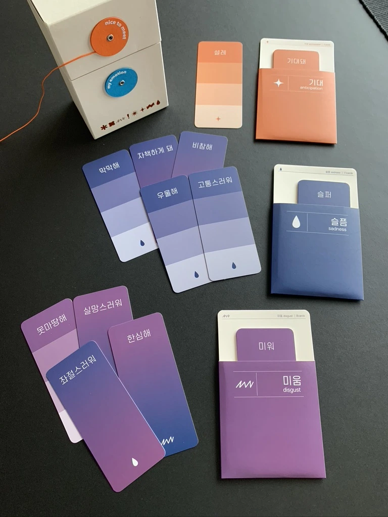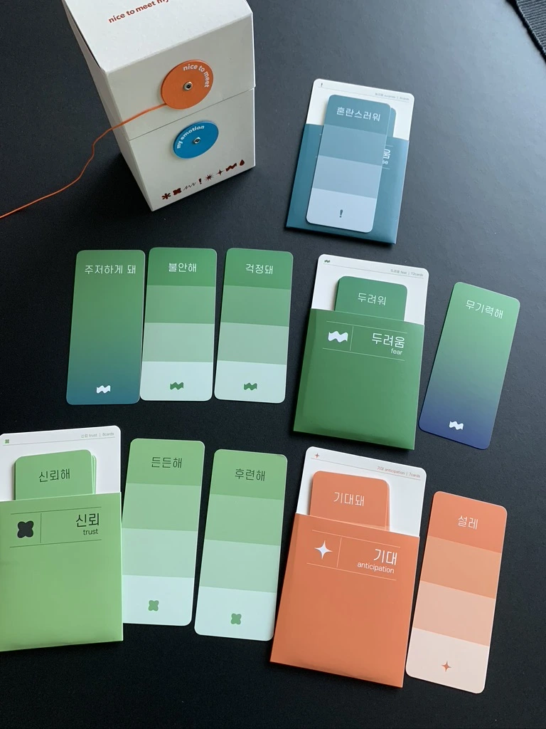 일기장을 들고 와서 7월 초부터 감정일기를 펼쳐보며 감정카드에서 그때의 감정을 카드로 한 장 한 장 꺼내어봤다. 이렇게 다채로운 감정이 존재할 수 있는가 싶을 정도로 많은 감정카드가 책상 위에 펼쳐졌다.