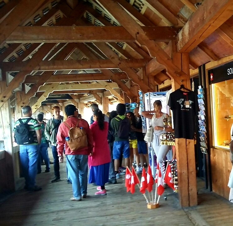 로이스강이 유유히 흐르고 중세 느낌 물씬 나는 목조 누각의 카펠교에는구경 인파들이 많이 왕복하고 있었다. 조금 한가해질까 기다려도 끊이지 않아 그 물결에 우리도 따라나섰다. 다리 지붕과 수직으로 맞춰진 삼각형 나무판에 그려진 그림들은 루체른의 역사와 수호성인 성 레오데가르와 성 마우리스의 생애를 그려 넣은 것이라고 한다. 1330년대에 건설되어 7백 년의 시간을 간직한 다리는 나무가 주는 친밀감과 아기자기한 느낌을 지니고 있었다. 위압적이고 차가운 콘크리트 다리에서는 느낄 수 없는 아늑함이 좋았다.