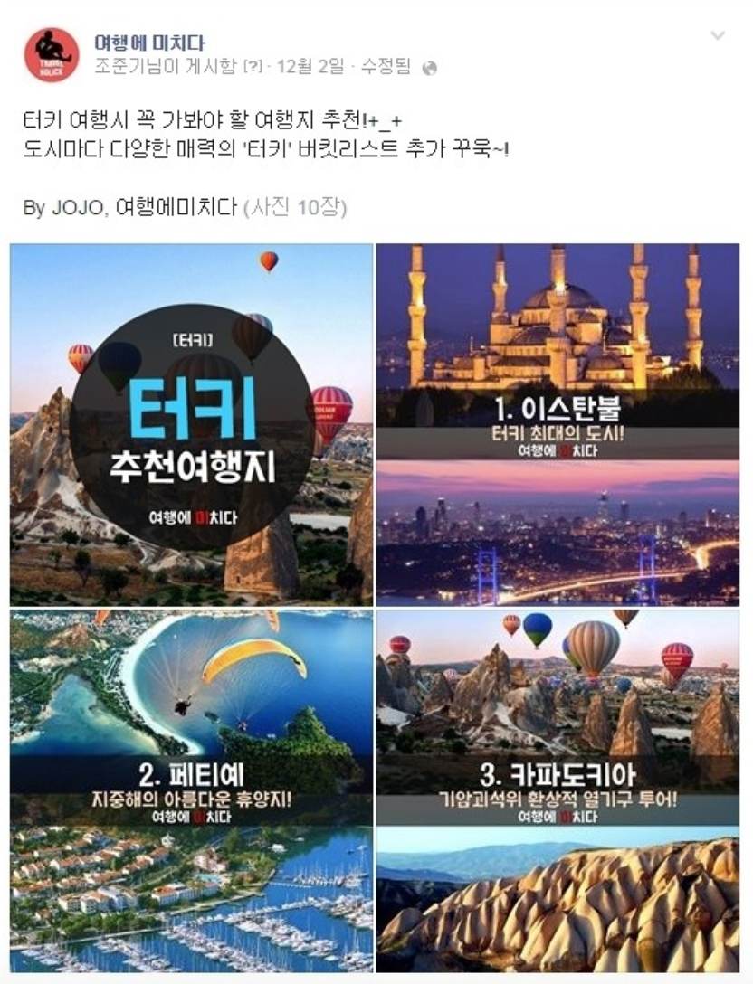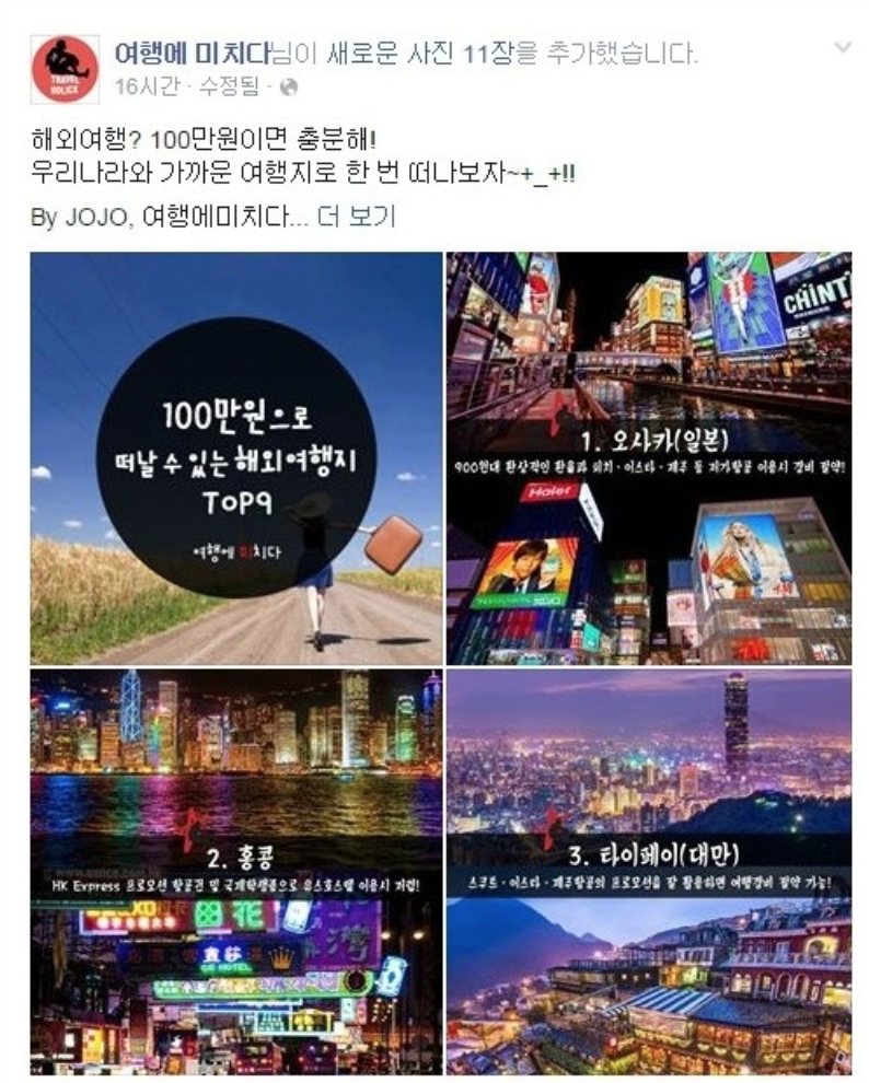 나 또한 이 로고를 잊지 못한다. '여행에 미치다' 라는 이름 자체도 직관적이라 기억하기 쉬웠으며, 여행이라곤 국내 여행밖에 잘 몰랐던 내또래 친구들에겐 이 페이스북 페이지는 놀라움의 연속이었다. "와 이런 나라가 있다고? ' 이렇게 예쁜 곳이 있어?" 학교와 알바를 연연하던 나에겐 한 권의 동화책과 같았다. 그만큼 새로운 여행지를 내 마음에 위시리스트로 꽂아준 페이지가 바로 '여행에 미치다'이다.