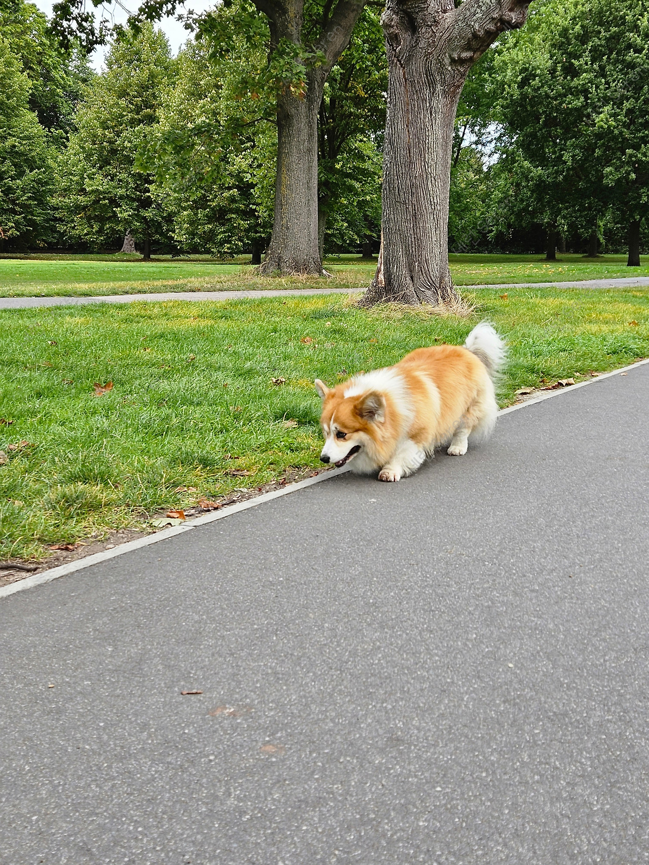 모녀의 영국 여행 마지막 날, 우리는 일찍이 체크아웃을 하고 짐을 맡긴 뒤 공원 산책부터 시작했다. 패딩턴 역에서 북쪽에 위치한 리젠츠 공원(The Regent's Park)으로 향했다. 고급 테라스형 주택단지에서부터 걸어 들어가다 우리처럼 산책 나온 웰시코기를 만났다. 목줄 없이 앙증맞은 다리로 주인과 함께 걷는 중이었다.
