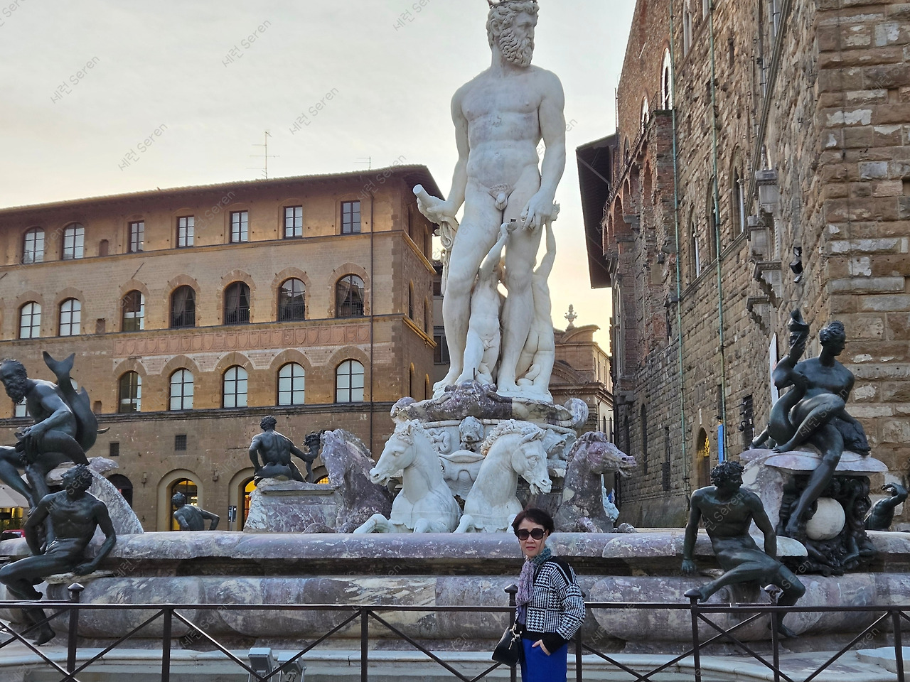 피렌체는 르네상스의 발상지답게 예술 작품이 넘쳤다. 특히 베키오 궁전 앞 시뇨리아 광장에는 다비드 복제상 외에도 큰 조각들로 가득 차 있다. 우선 궁전 왼쪽을 보면 넵투누스 분수(Fountain of Neptune)가 있다. 이 분수는 코지모 1세가 대공국 체제를 확립하면서 정치적 정당성과 위엄을 보여주기 위해 제작되었다. 특히, 내륙 도시인 피렌체가 '피사의 항구 개척'을 통해 지중해로 진출하는 관문을 확보했다는 점을 기념하고자, 바다의 신 넵투누스(로마 신화의 포세이돈)를 상징물로 선택한 것이라고 한다.