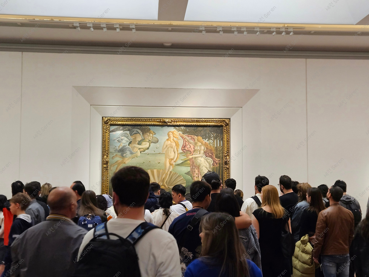 산드로 보티첼리의 또 다른 작품 <비너스의 탄생> 앞에는 사람이 더 많이 몰려 있었다. 그리스 로마 신화에서 비너스 탄생 부분에 대한 이야기와 함께 이 그림이 삽화로 실려 있었는데 직접 보니 감격스러웠다.