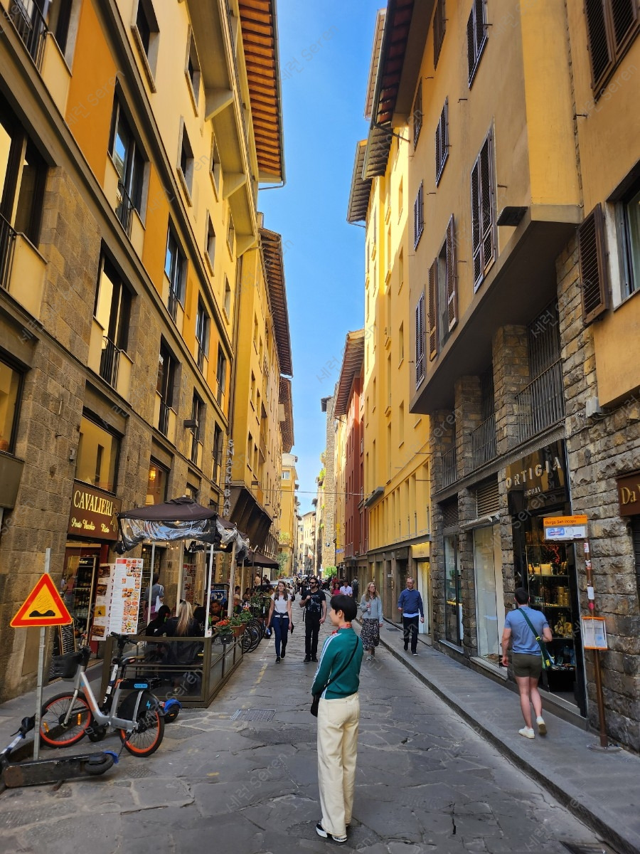 베키오 다리(Ponte Vecchio)를 건너니 황금빛 건물들로 가득한 골목이 나타났다. 이탈리아 정취가 느껴지는 골목에서 사진을 신나게 찍었다. 어떤 각도로 찍든 화보처럼 나왔다.